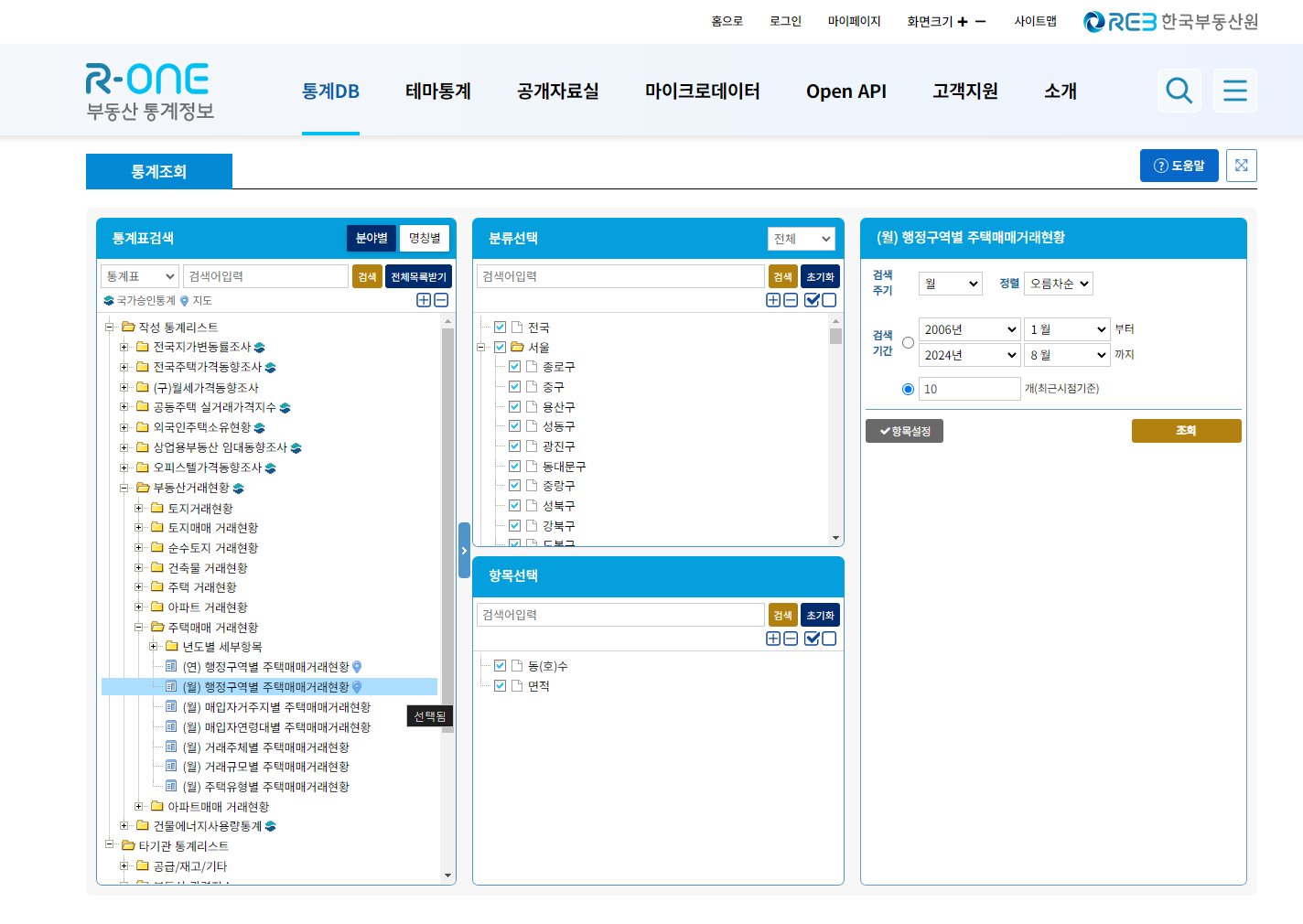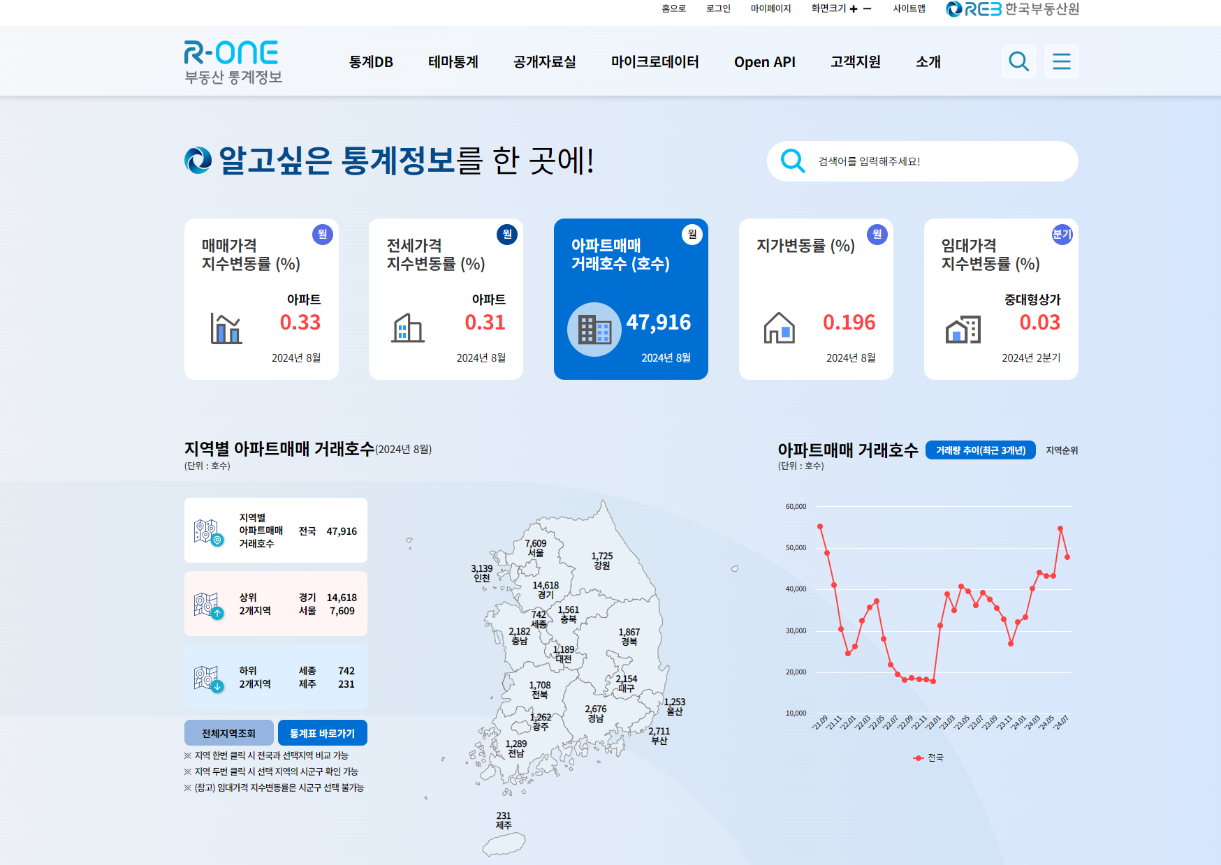한국부동산원의 메인페이지에서 ‘부동산통계 R-one’으로 이동하면 지역별 아파트 매매 거래호수를 바로 확인할 수 있구요,