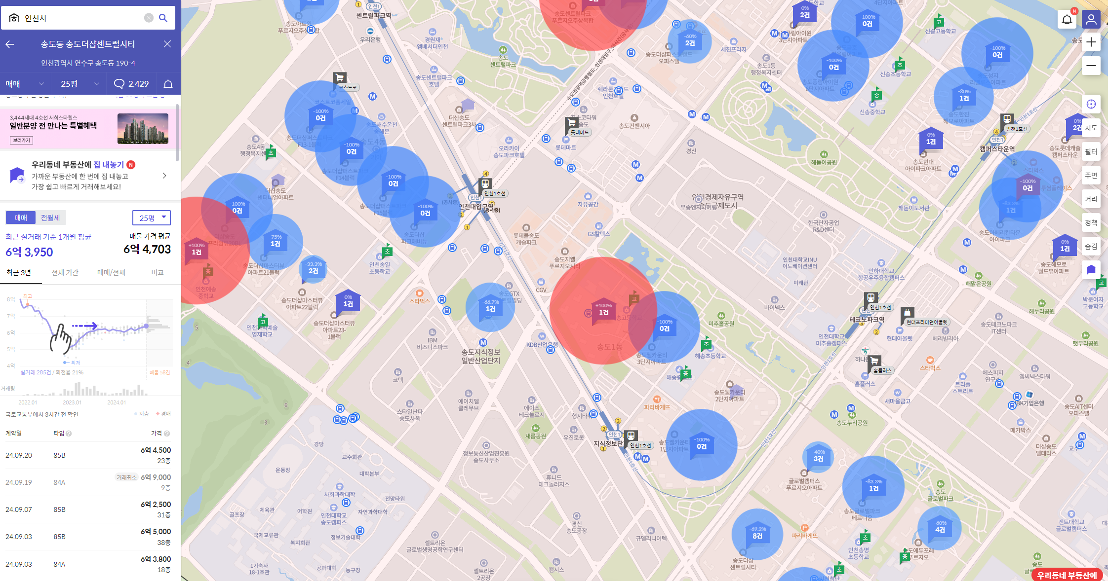 네이버 부동산 뿐만 아니라 '호갱노노'에서도 지역별, 아파트단지별 거래량을 확인할 수 있습니다.